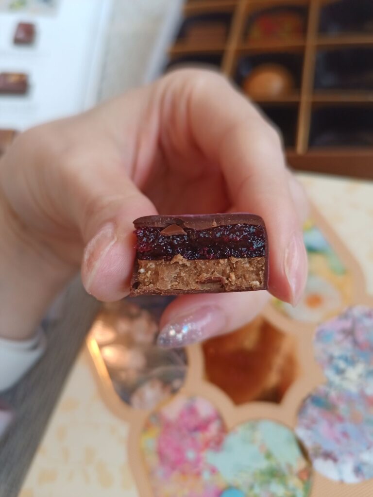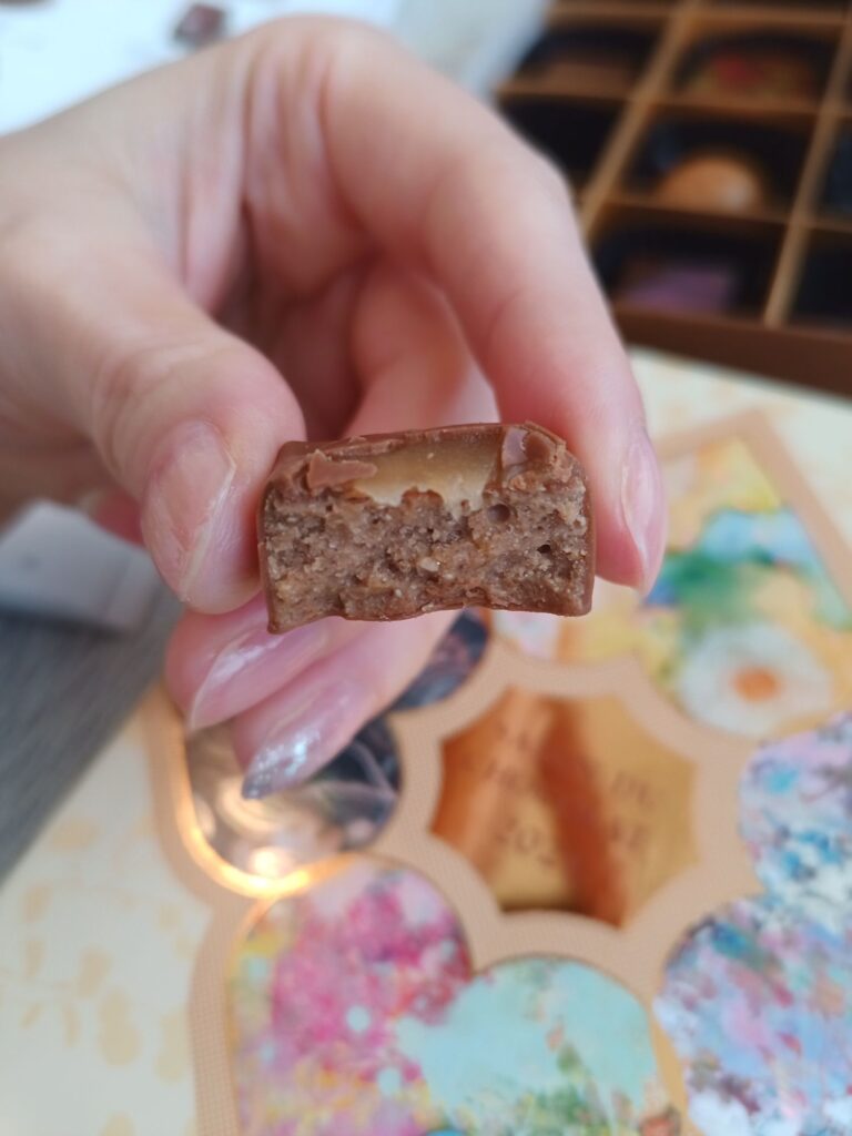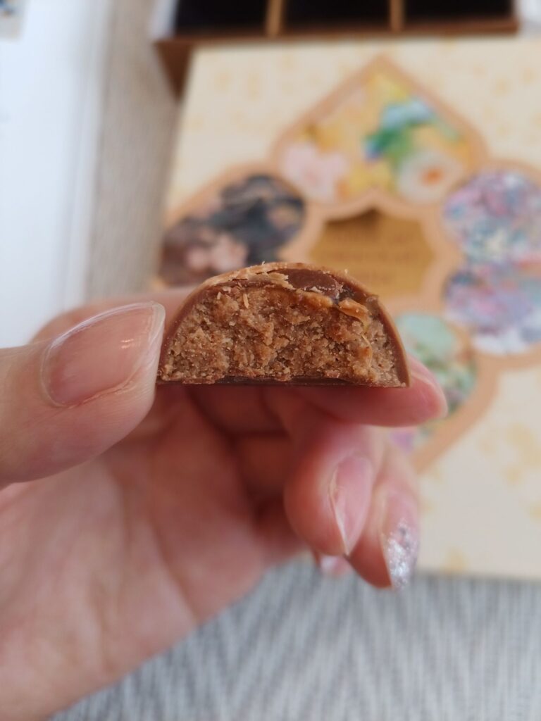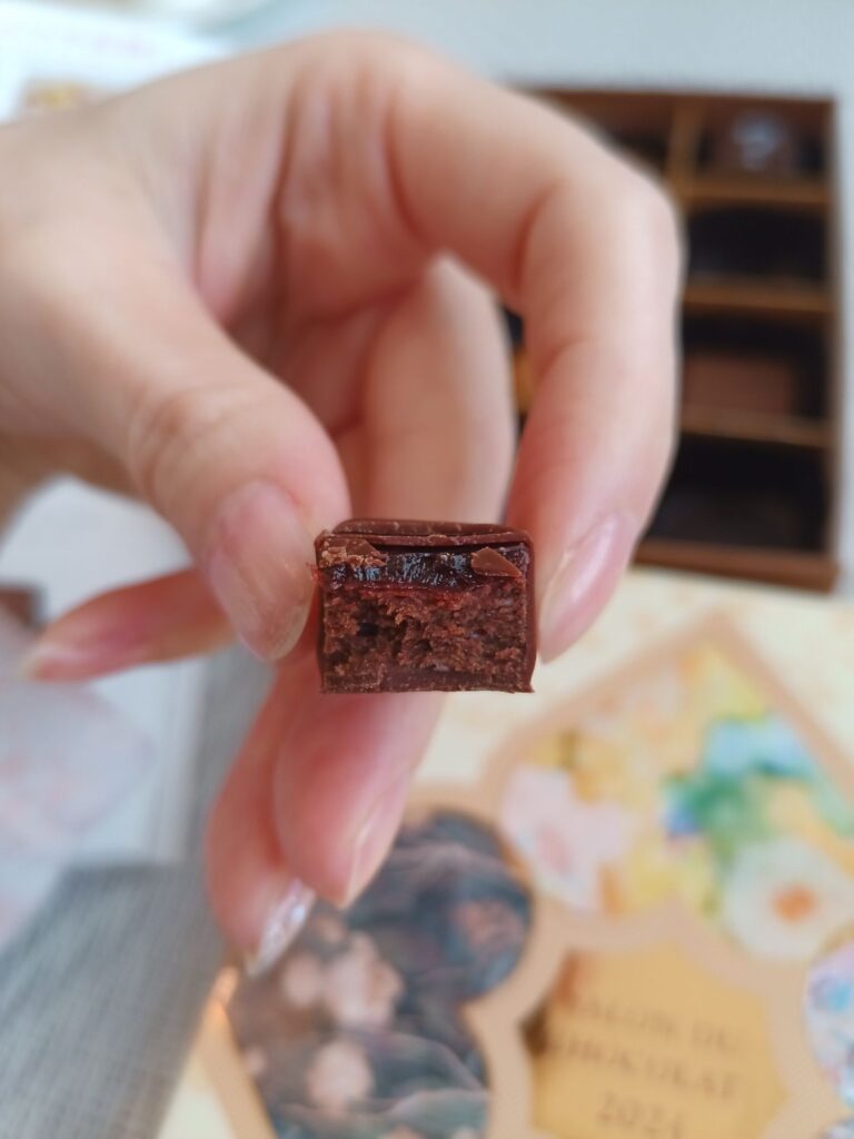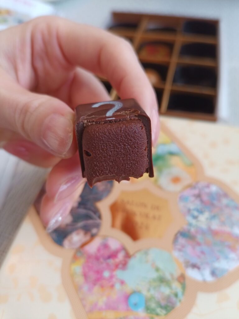 とても複雑なフレーバーのガナッシュ。すごくフルーティだけど渋みもあって、不思議だけど美味しい。ガナッシュもすごくなめらかでたっぷり入っていて、すごく大きい!久しぶりにショコオキャレを食べたけど良い!