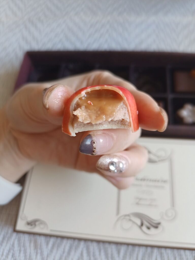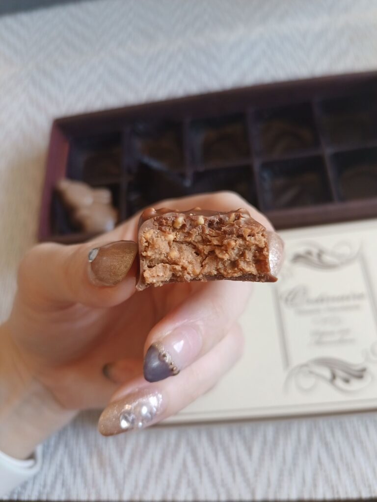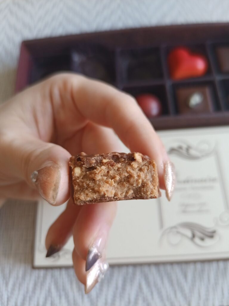 ちょっぴりぬとっと系のプラリネ。ナッツの香ばしさが弱め。