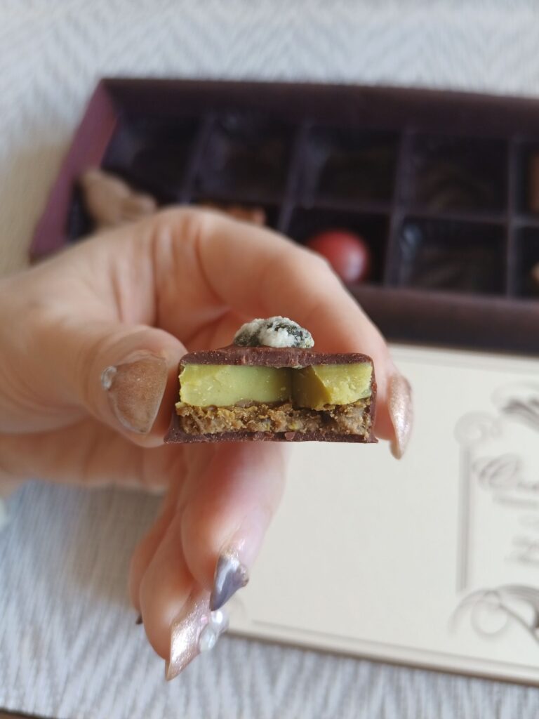 ふわりとピスタチオフレーバー広がるプラリネとガナッシュの2層。ガナッシュがちょっぴりぬっとり系。