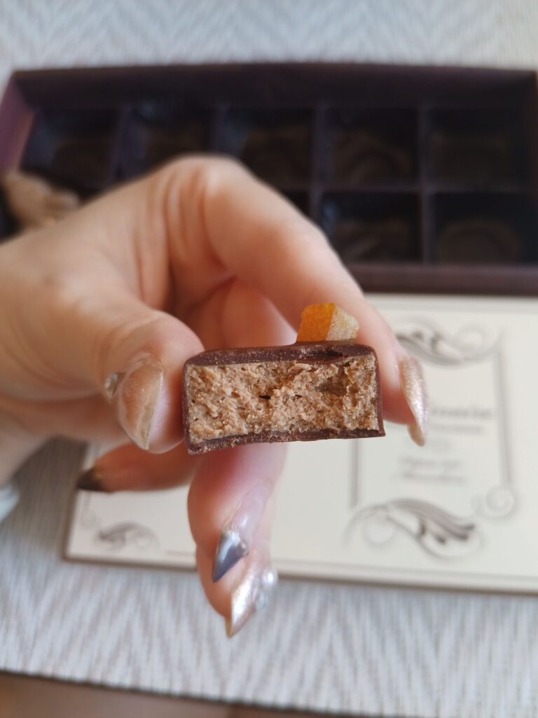 初めていただくフレーバー。カリカリキャラメリゼ食感のジャンドゥーヤに香り高いオレンジピール。