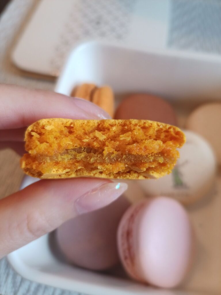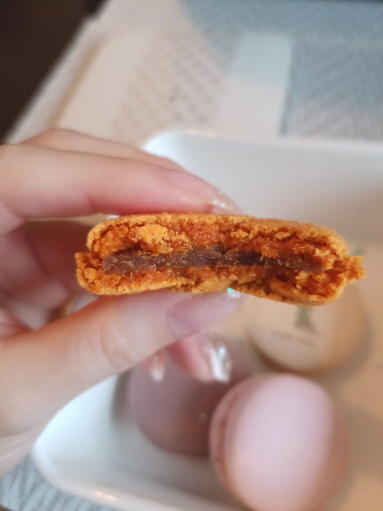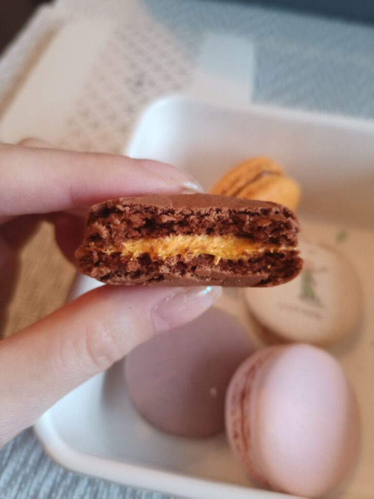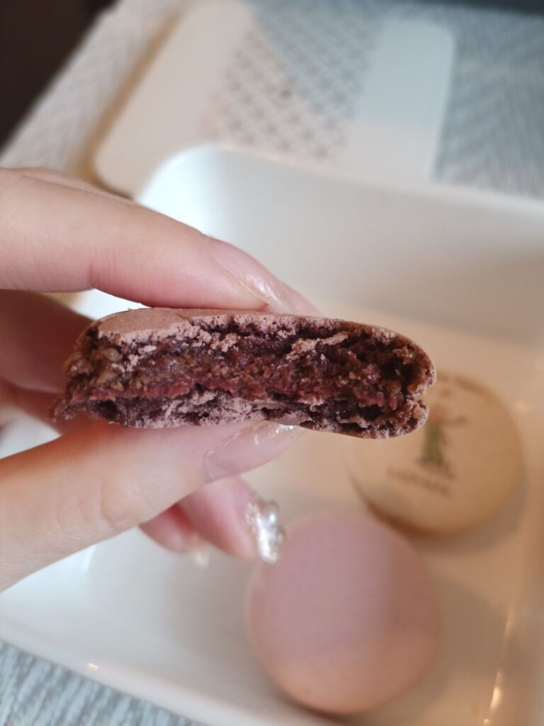 ニチ〜としたギモーヴは果実味溢れるオレンジのフレーバーがすごく効いていて、単品で食べたいほど!ショコラのマカロンはわりとビターで、ギモーヴと合わさってるからなのかいつもよりパサっと感じる。
