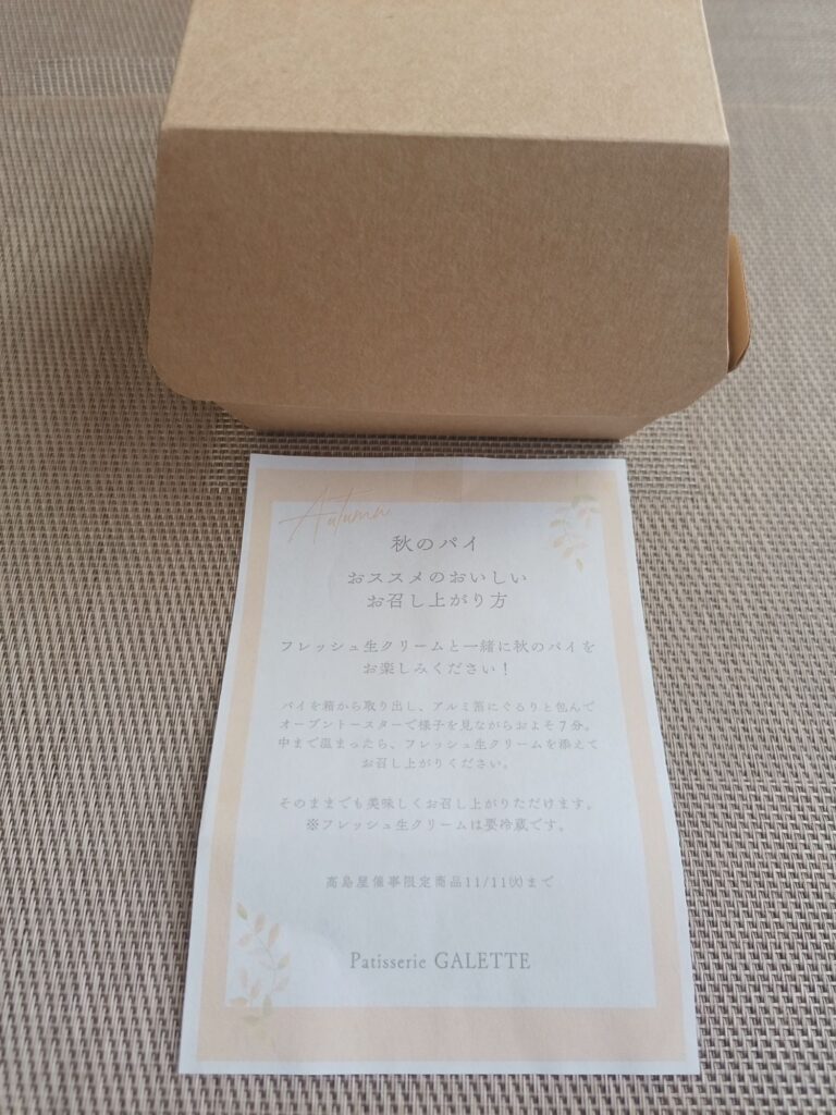髙島屋に出展中で、今回は「秋のパイ」なるスイーツが3種出ていたので購入しました。