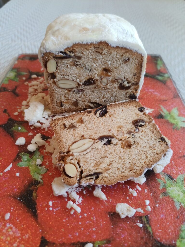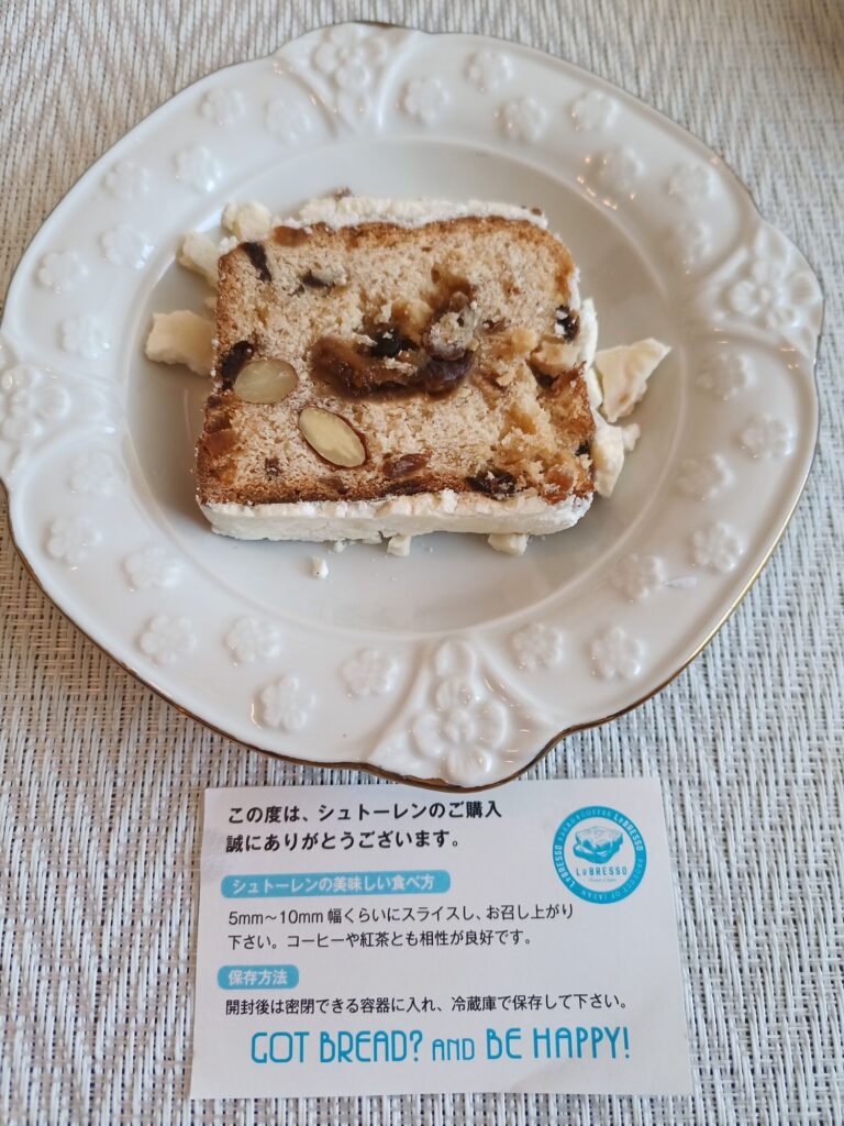 生地はしっとり系が好みだけど、ラム酒漬けのドライフルーツがたっぷりで風味が良いので、味が好みのタイプのシュトーレンでした。賞味期限は一ヶ月程。