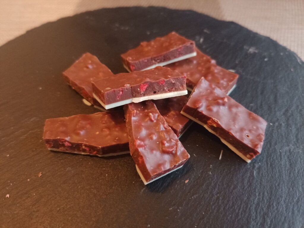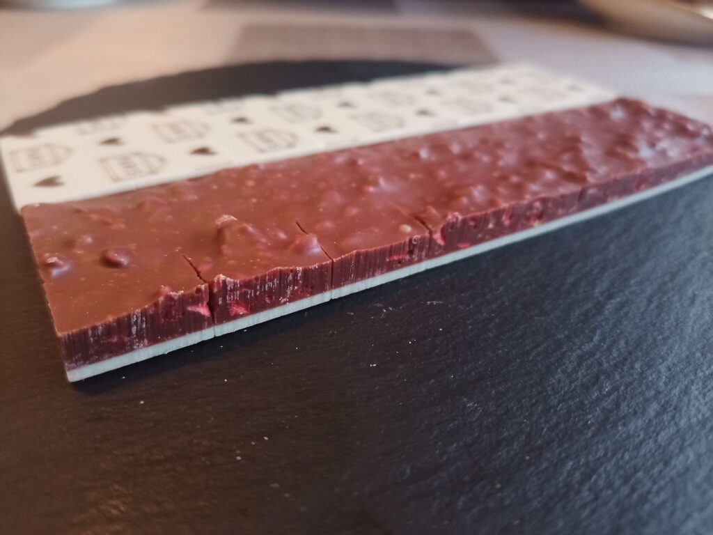 ダークチョコレートは56%とそんなに多くないので、程よいカカオ感。プラス、ホワイトチョコレートのクリーミーさと甘酸っぱさが相まって可愛い味!