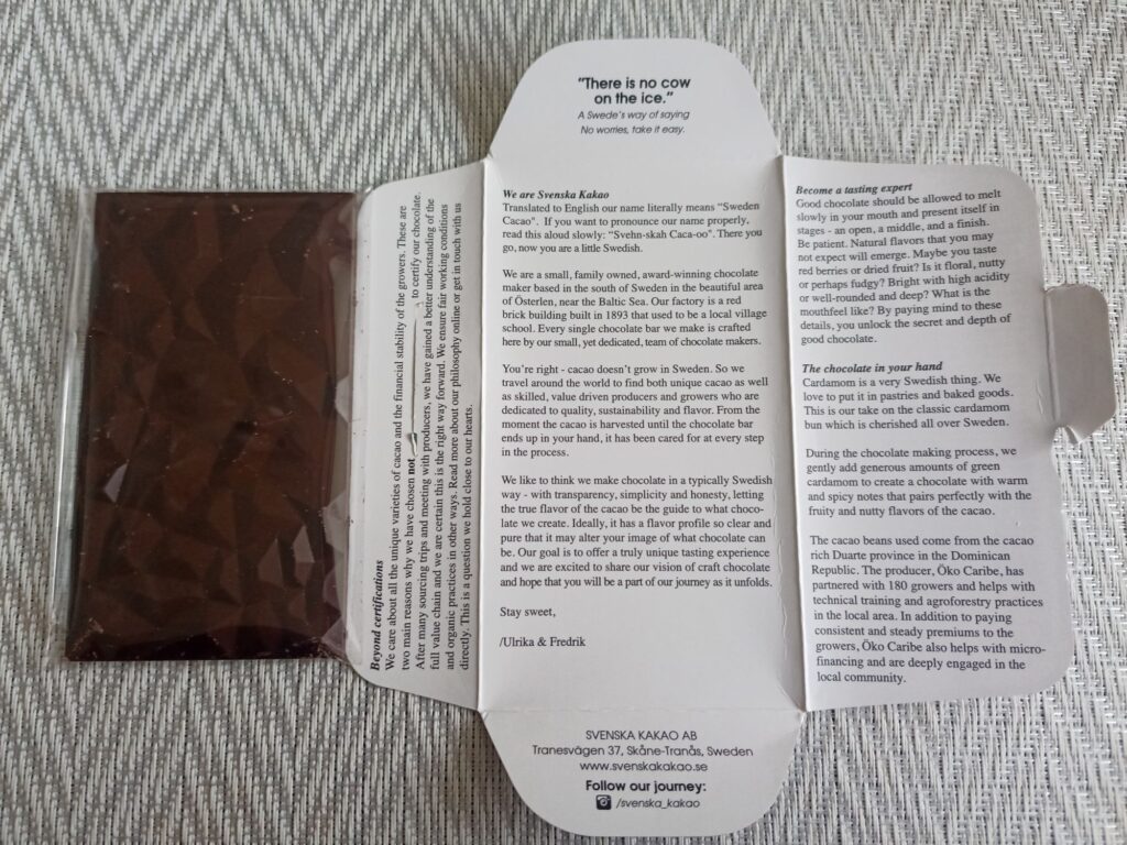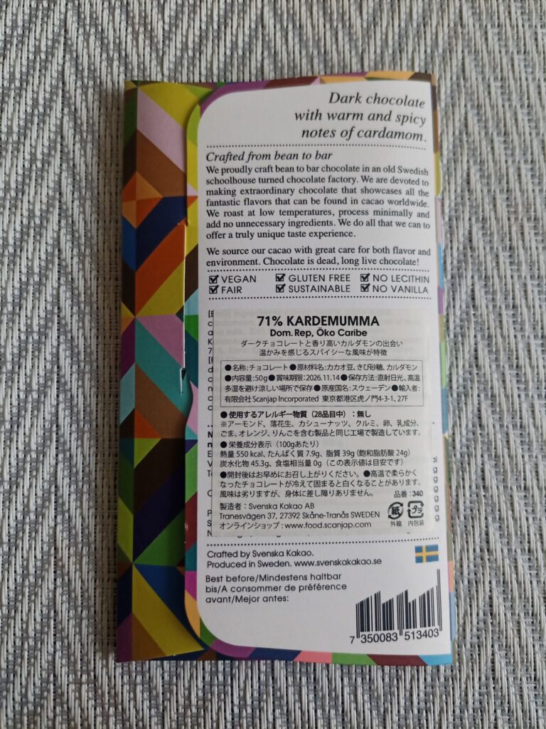 カルダモンパンは食べたことがないけど、なんだかすごく甘そうなイメージですが、このタブレットは甘さ控えめなダークチョコレート。カルダモンパンがとても気になる…