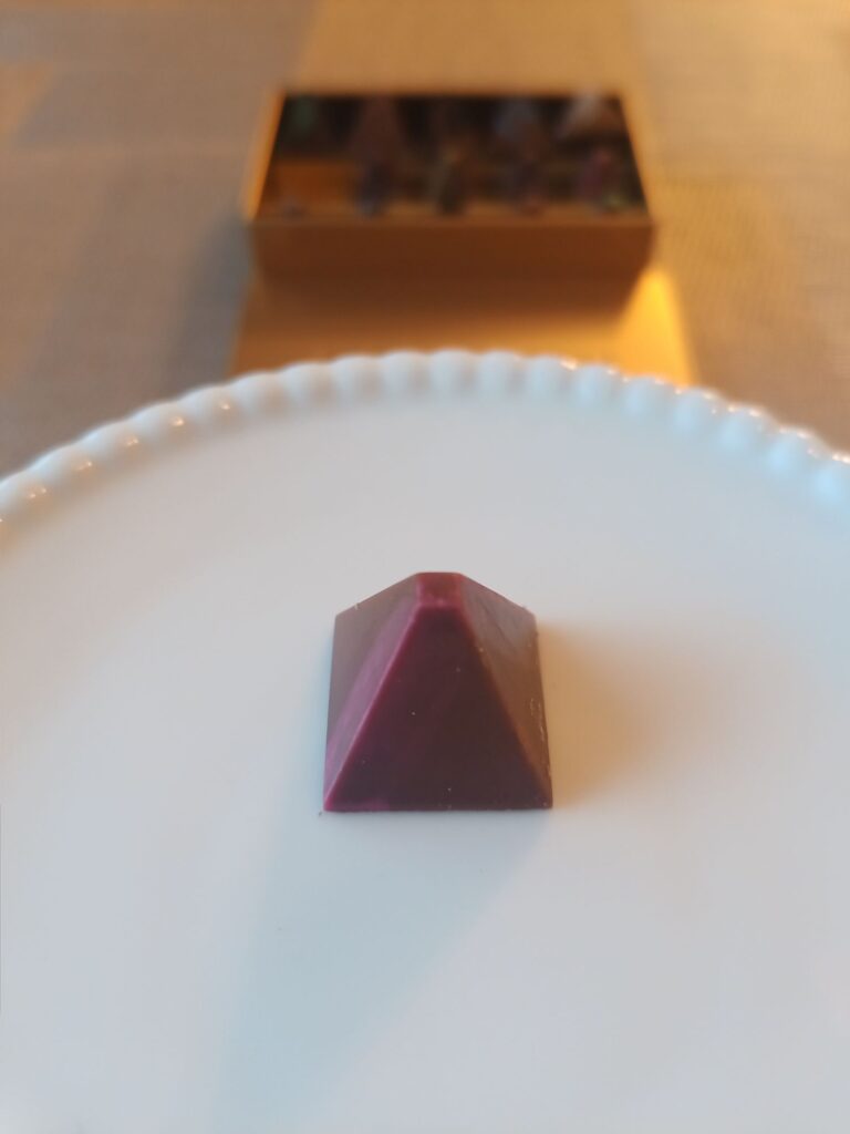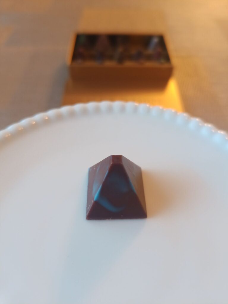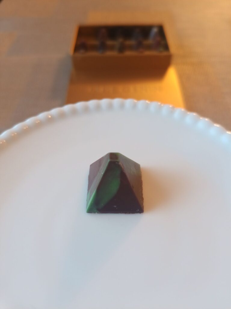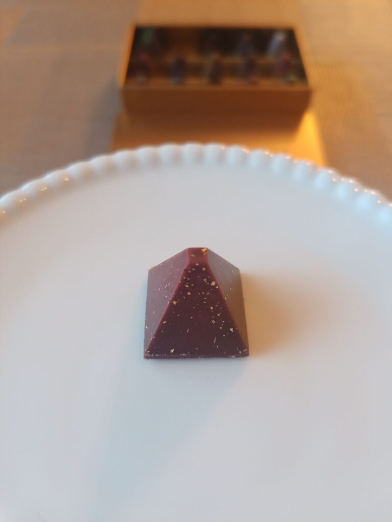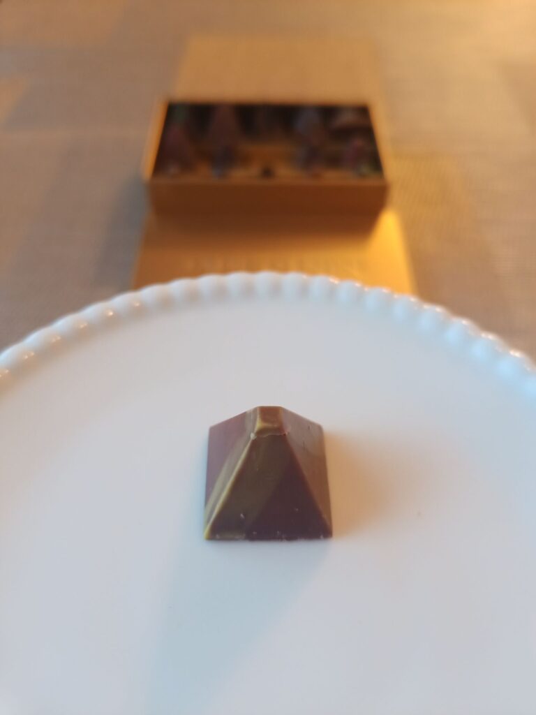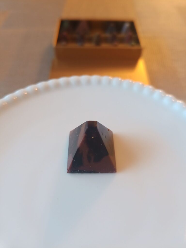 ブランドを象徴するピラミッド型のショコラは、繊細な層構造とモダンな造形が映える代表作。ひと口で味わうことを前提に仕立てられた小さなボンボンショコラ。