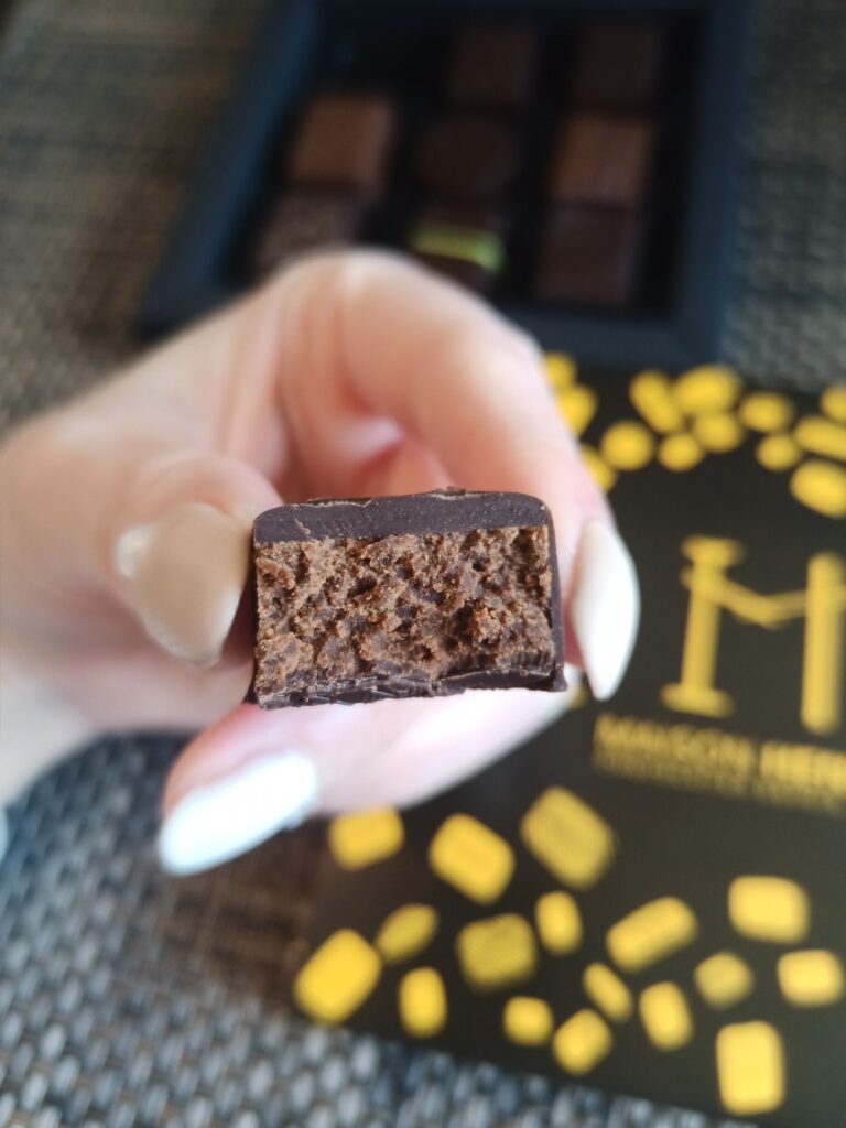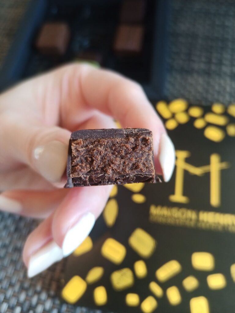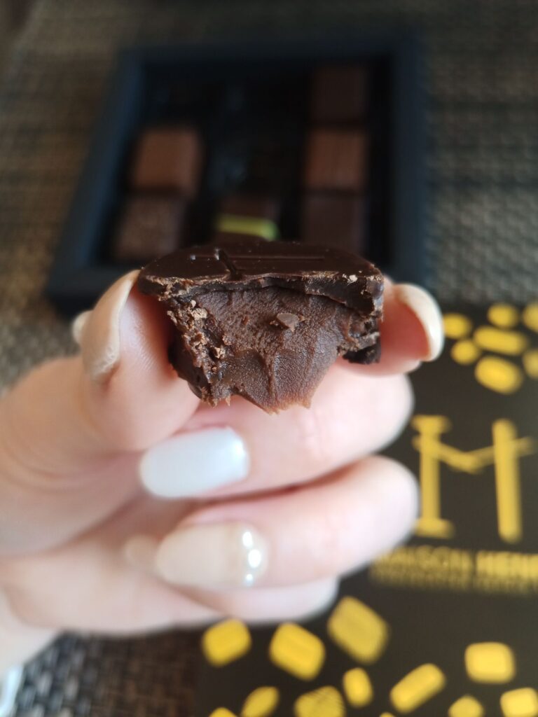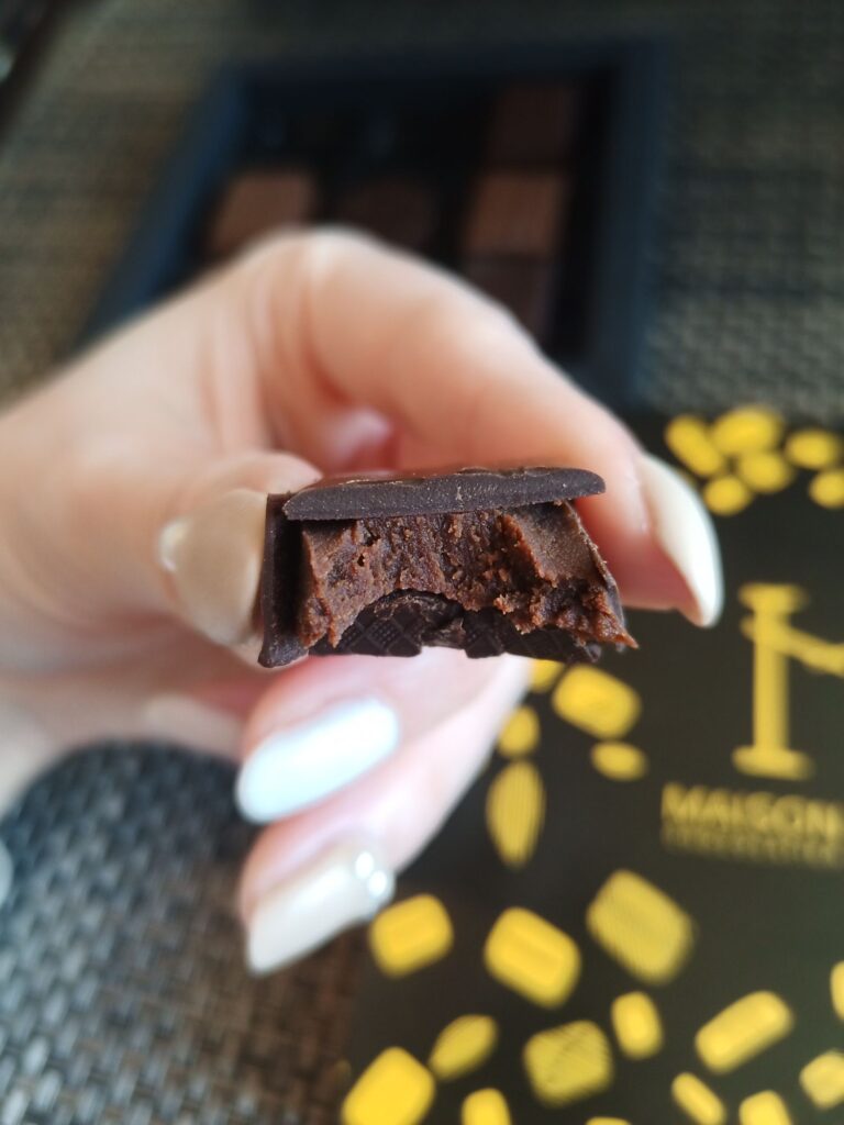 ボンボンショコラのサイズはかなり大きめなのにガナッシュが軽い!ふわりと華やかに香るフレーバーで口当たりが軽くてするりと溶けゆく。