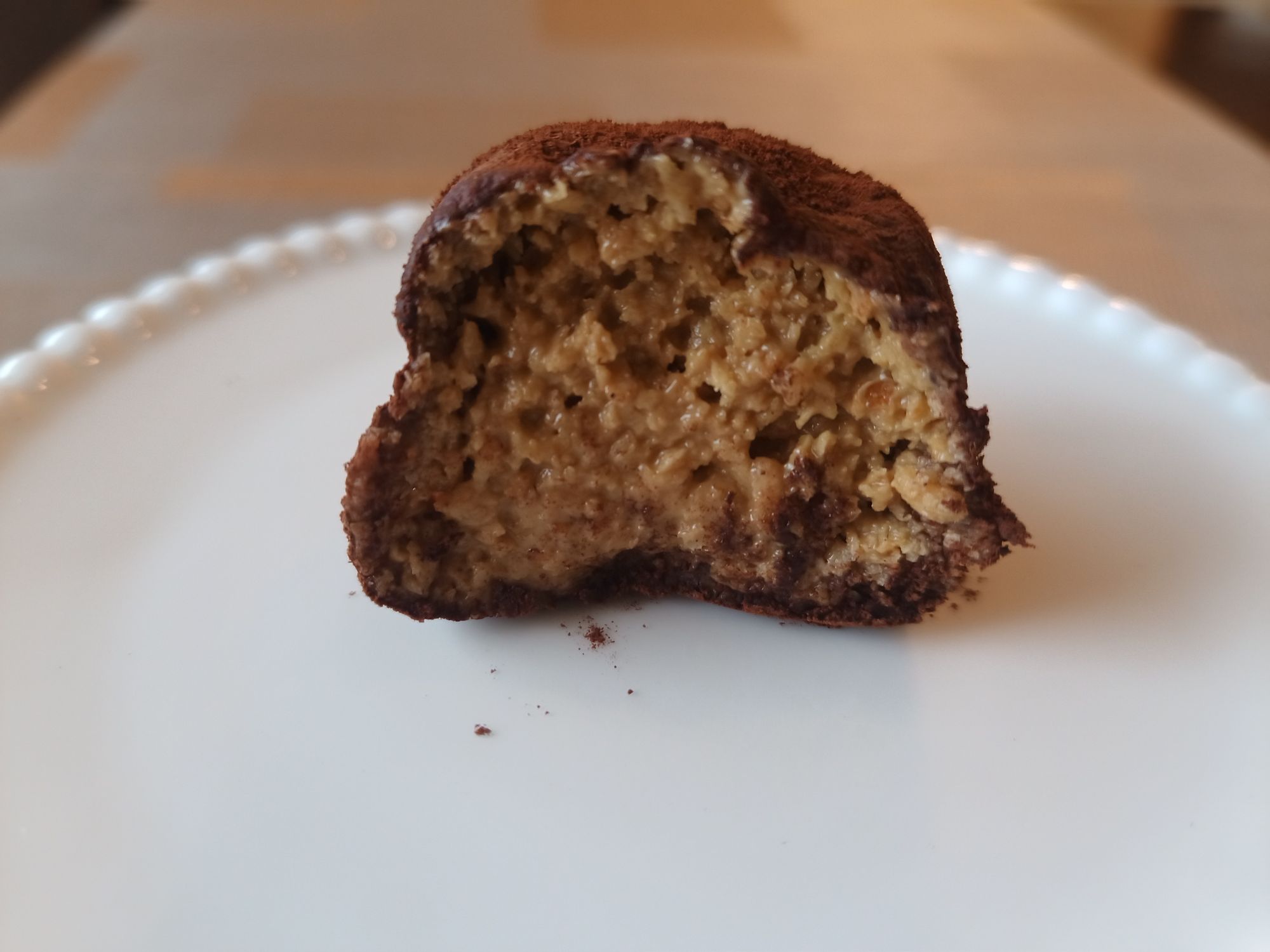 ゴリゴリ食感のピスタチオプラリネを、やや硬めのムチムチ求肥に包んでココアパウダーでまぶしてあります。