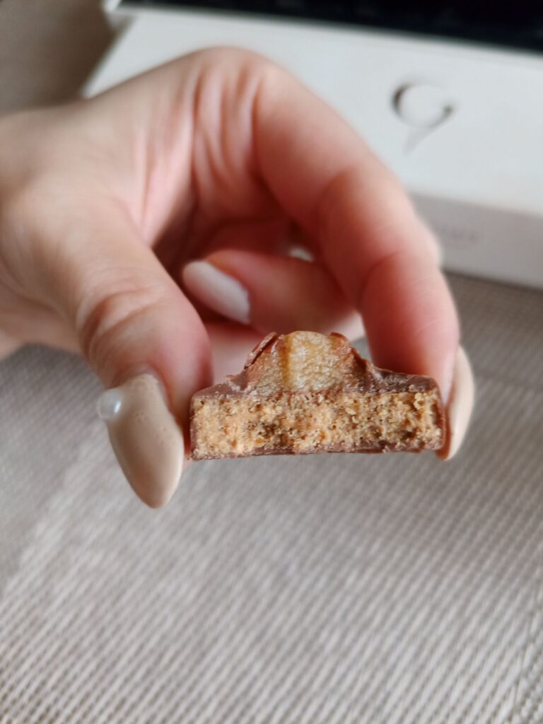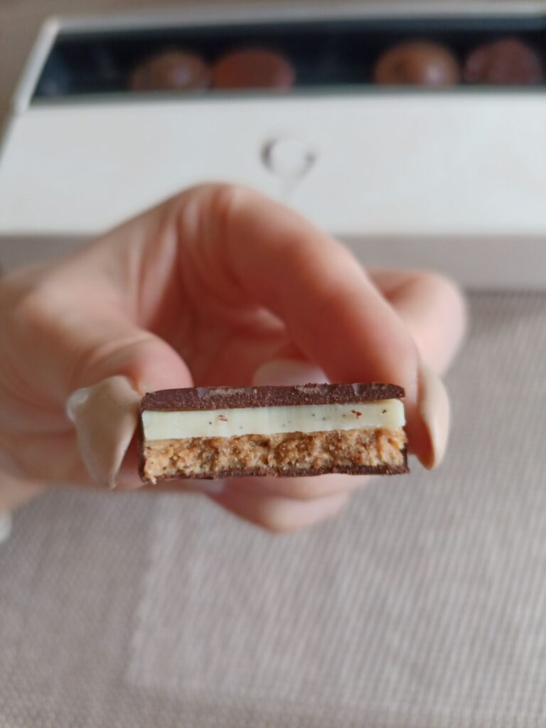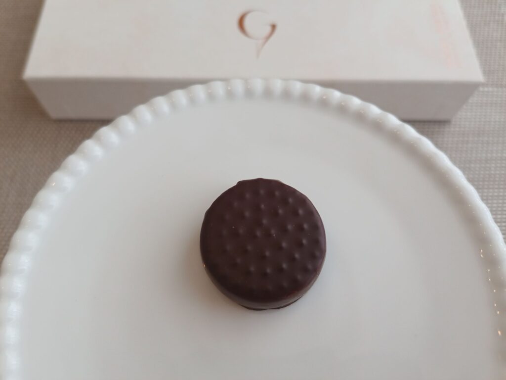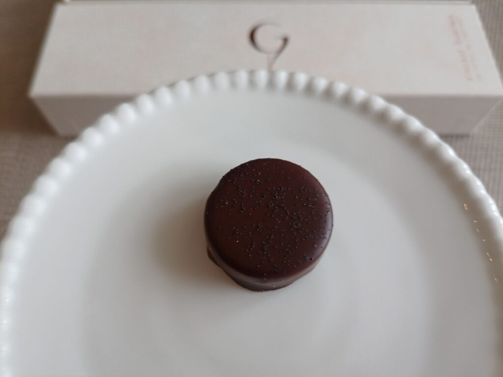 バニラ香るホワイトチョコレートガナッシュサクサクのサブレ。コーティングのチョコレートがビターでやや苦め。