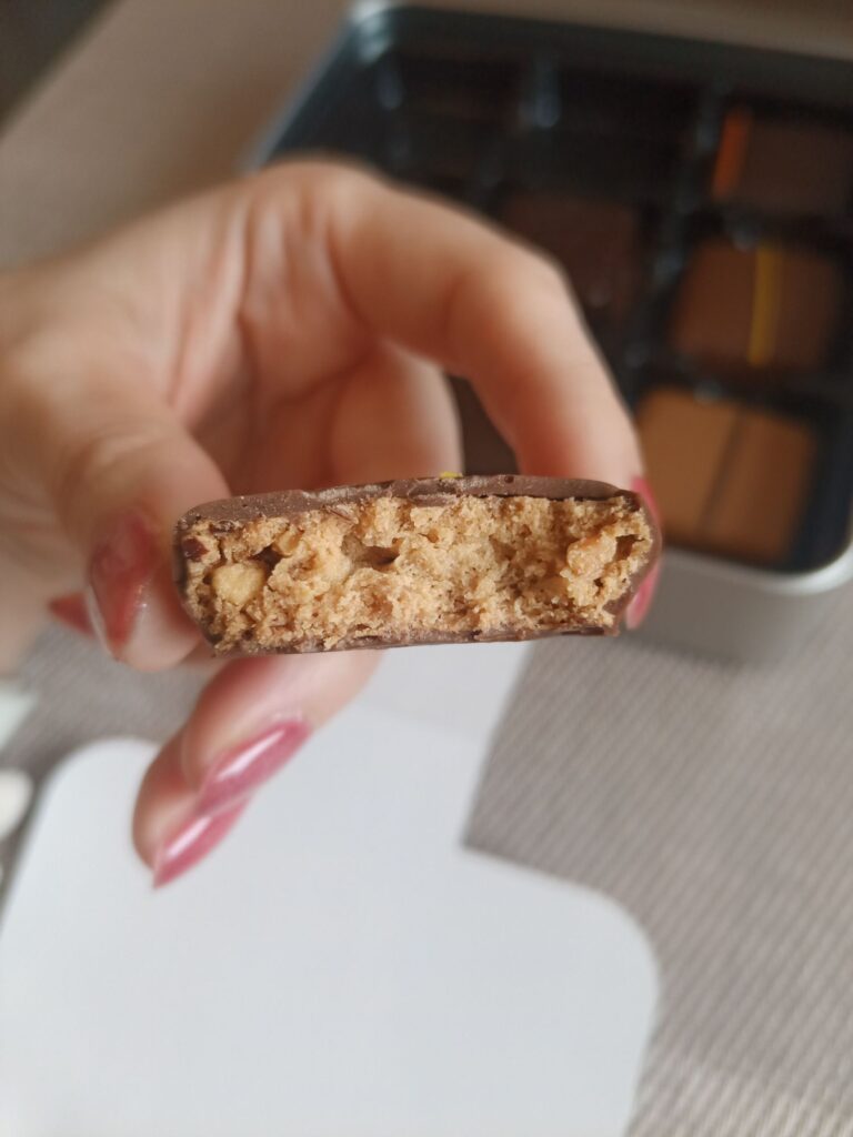 砕いたヘーゼルナッツ入りの香ばしいサブレで、ミルクチョココーティングのヘーゼルナッツサブレとして美味しい。