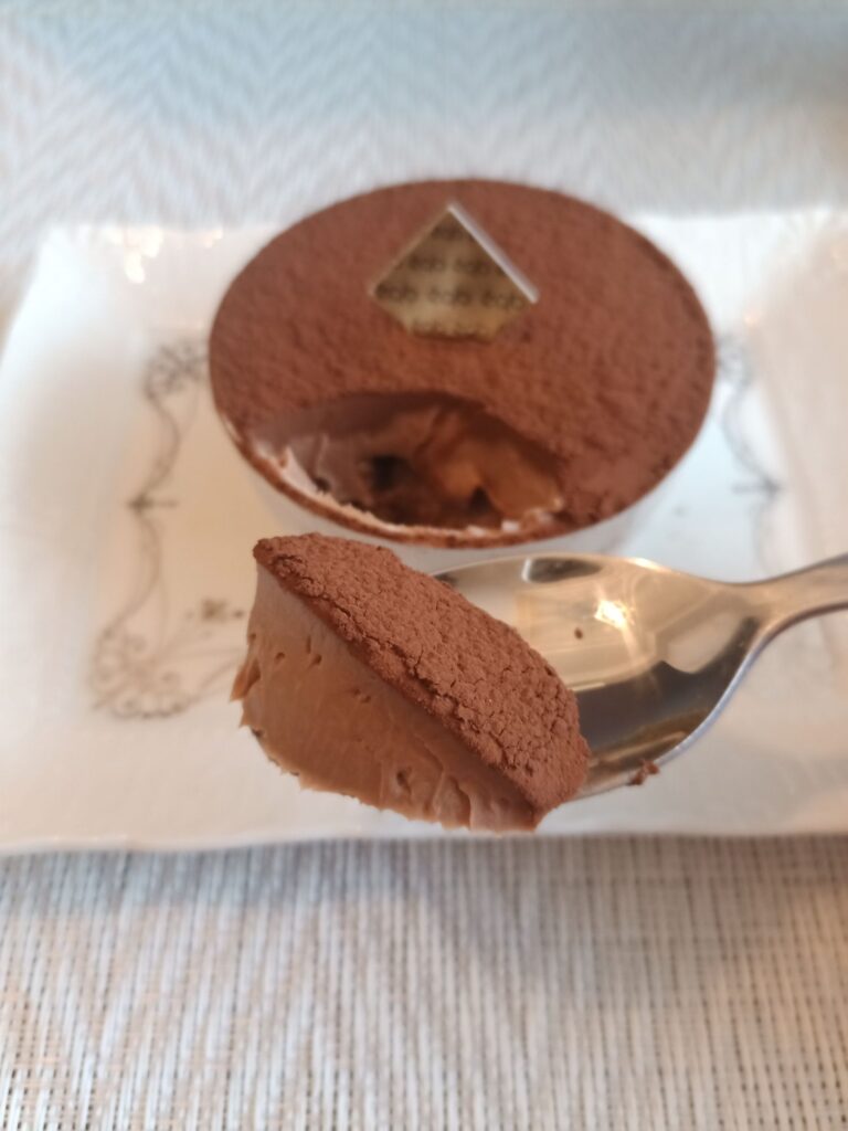 ミルク強めの生チョコ、その下に砕いたチョコアーモンドとビターチョコレートのしっとりビスキュイ。トップに結構大量のココアパウダー。