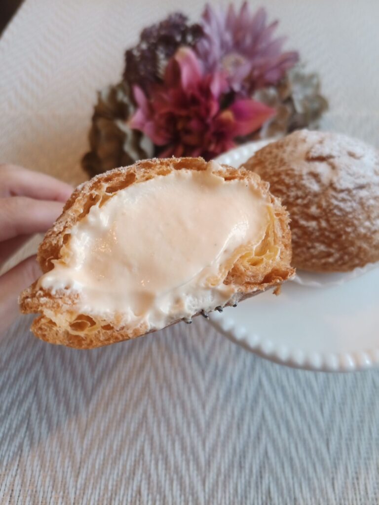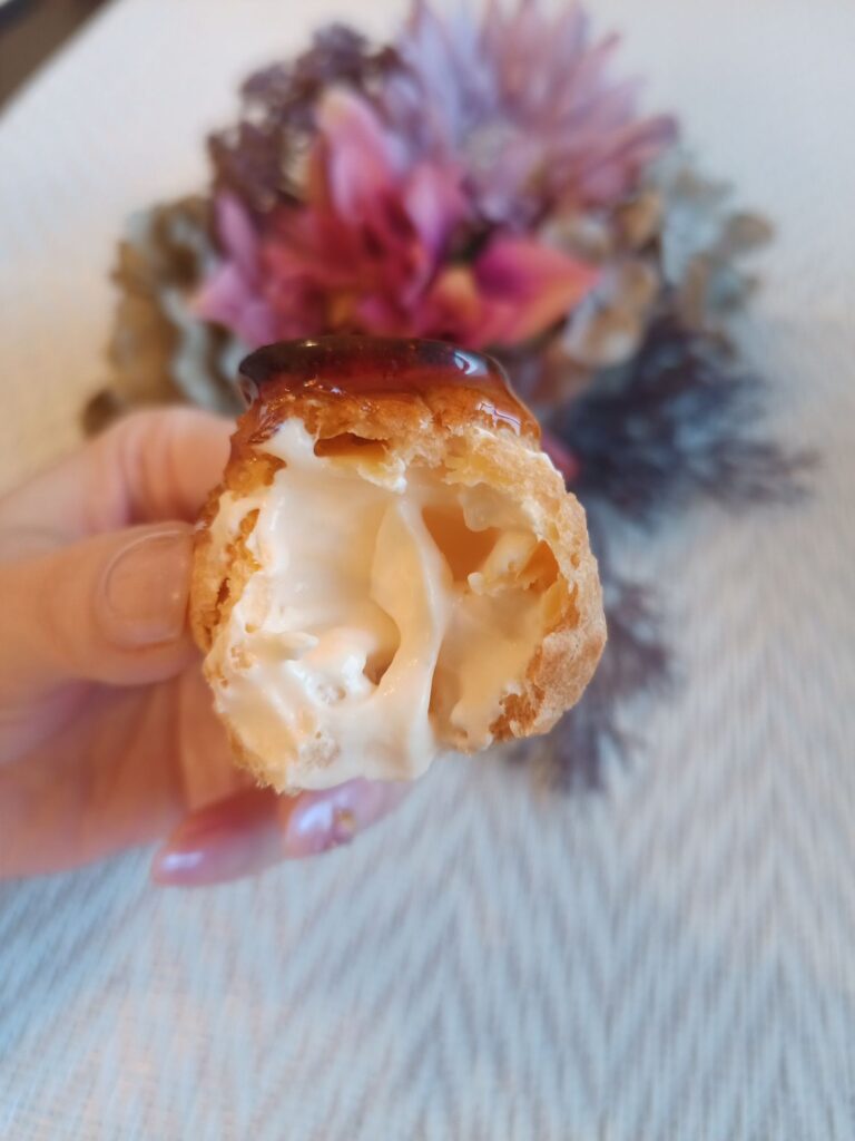 私はこちらのクリームが大変好みだったので、この溢れんばかりのクリームが入ったクッキーシューをもう既にリピしたいけど、手軽に食べられる大人なカリカリ焦がしキャラメルシューも捨てがたい…