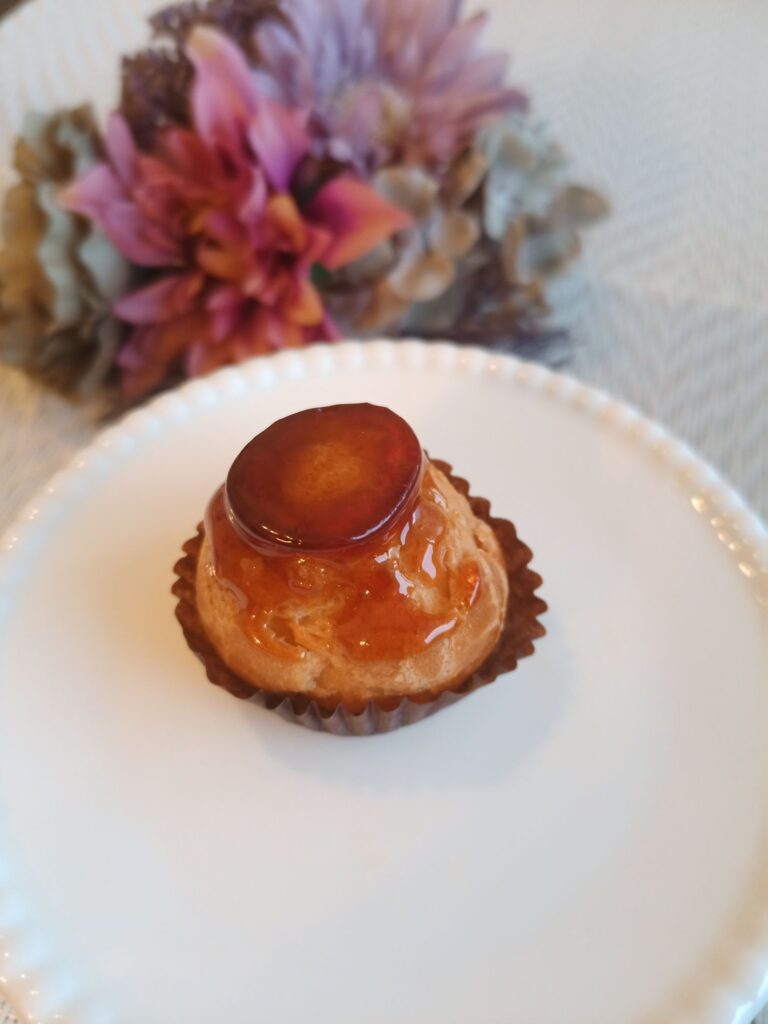 こちらのシュー生地はクッキー生地ではなくプレーンなやわらかめの生地。トップにキャンディ状にカリッとした焦がしキャラメルがのっていて、これがまた大人なほろ苦で美味しい!