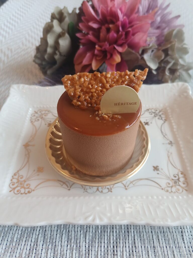 ムースにしてはかためでギュッとしたミルクチョコムースはカカオの風味がすごく広がる!キャラメルクリームは色が薄めなので甘めにミルクキャラメル的なのかと思いきや、甘さ控えめのしっかり焦がしキャラメルフレーバー!薄く上にかかっているキャラメルはかなり苦みの効いたキャラメルで、キャラメルの強さとケーキ全体の引き締め役にもなってる!
